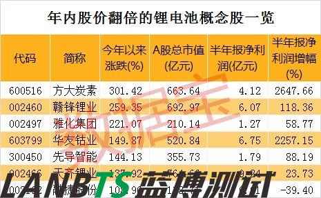 數(shù)據(jù)寶統(tǒng)計顯示,剔除近一年上市的次新股,25只個股年內(nèi)漲幅在100%以上。值得注意的是,7只個股來自鋰電池板塊,分別是方大炭素(600516)、贛鋒鋰業(yè)(002460)、雅化集團、華友鈷業(yè)(603799)、先導(dǎo)智能(300450)、天齊鋰業(yè)(002466)、融捷股份(002192)。
